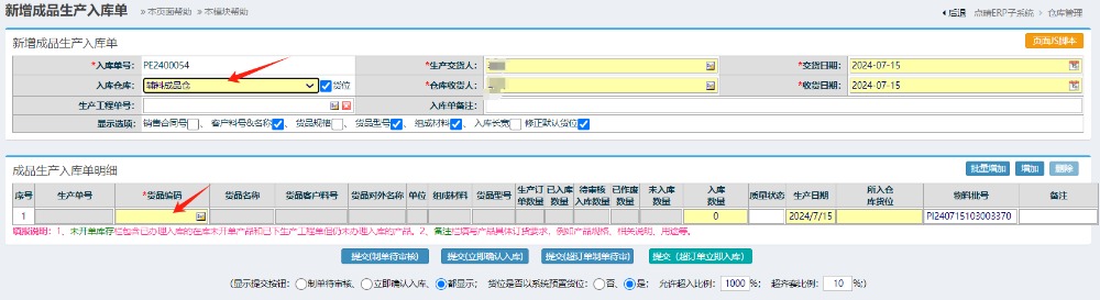 进入界面后,选择对应的入库仓位,再点击明细栏的物料编码栏位,如下图所示: