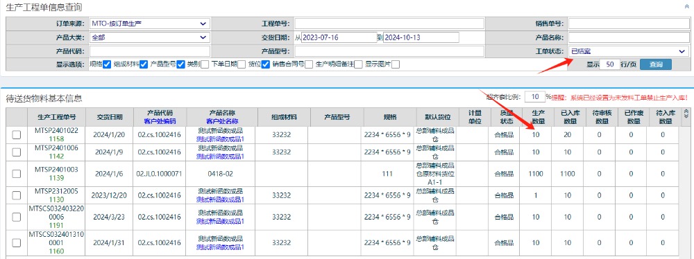 点晴模切ERP已结案的生产工单如何继续做入库操作