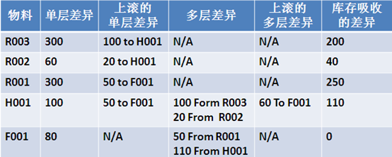 可以看到,因为采购价与标准价的不一致,产生了-4095.82元的材料采购差异,对于这笔差异的处理方式,我们可以采取的措施有以下几种。 结转至销售成本如果差异较小并且相对平稳,我们可以将所有差异直接通过手工帐的方式,直接结转至销售成本。在西方国家,这是一种非常普遍的差异结转方式,但在目前中国的会计制度下,这种方式仍存在争议。 这是传统手工帐时代的思想,这样做的好处就是:简单。坏处就是:过于简单。如果差异较小,这样做是可行的,但在目前激烈的市场竞争环境中,采购压力越来越大,随着近年来不断升高的通胀压力,工业原材料的价格水涨船高。价格的波动将直接导致差异的增加,如果将巨额的差异直接转至销售成本中,这将直接影响本月的损益,导致利润虚低,这将成为审计上的风险,同时,这也限制了企业对物料实际成本的管理。 期间分配法从上一种方法中,我们可以了解到,当采购差异很大时,我们原则上不允许将差异直接转至销售成本中,我们采取的方式是,将差异在销售成本和物料中进行分摊,举例来说,如果本期共生产A物料100PC,销售60PC,40PC存入仓库,采购差异为200元,则销售成本需分摊120元差异,库存应承担40(80)元差异。其中,库存所承担的差异,又将经过多级滚算,分配到不同的产成品、半成品、原材料中,从而还原出物料的实际成本,并将另一部分差异,结转至销售成本。 目前存在的问题如果需要在SAP中实现期间分配法,我们可以采用物料分类帐,来实现所谓的“成本还原”。但物料分类帐也有一些不足之处。 如果要使用物料分类帐,建议使用标准价格体系,因为移动平均价已经是一种实际价格,不需要进行还原。并且如果使用了物料分类帐,所有物料的标准成本,必须在当月物料发生业务交易之前进行修改。原因是物料分类帐计算的逻辑,是以标准价为唯一标准,经和实际价对比后计算差异,修改标准价格将导致计算差异依据的变更。所以财务部门必须提前规划好标准价格的发布时间。 物料分类帐对企业后勤业务的管理水平,有相当的要求。因为如果要将差异正确的进行分摊,那就必须指定每一笔差异所对应的物料、发生原因等关键数据。某些不规范或不合理的业务,将直接影响差异分摊的正确性。例如盘点差异,如果企业每月都会进行盘点,实盘库存与系统库存差异巨大,这部分差异将无法正确的进行分摊,导致实际成本的不正确。 除此之外,因为物料分类帐关于库存差异的分摊是层层上滚的,如果产品BOM的层次比较复杂,半成品较多,很可能导致系统运行缓慢,影响月末CO结算速度。 综上所述,启用物料分类帐的前提有: Ø 采用标准价格对物料进行管理 Ø 企业材料采购差异较大,价格不稳定 Ø 企业物料数量较少,BOM结构较为简单 Ø 企业管理规范,有能力建立相关配套制度 注意:原则上如果物料使用移动平均价时,也可启用物料分类帐,但移动平均价反应的已经是实际成本,所以启用物料分类帐的意义不大。 物料分类帐差异分摊原理首先明确一点,无论是否使用物料分类帐,只要系统使用了标准价格甚至移动平均价,发生业务时都有可能产生差异。简单的说,物料分类帐不会对差异的产生造成影响,物料分类帐真正的作用是规范了差异的分摊,并利用分摊的结果,计算物料的实际成本 差异类别在讲述差异分摊的原理之前,首先需要介绍的是差异的类别,物料分类帐中,差异分为两类:单层差异、多层差异。 简单的讲,单层差异就是物料自身所产生的差异,例如材料采购差异、生产订单差异、发票校验差异、期初导入差异等。 多层差异一般是由这个物料的下层物料分摊而来的差异,例如生产订单中,投入到这张订单中的物料所差生的差异,这部分差异主要由BOM结构来确定,位于BOM底层的物料不会吸收多层差异,但会向他的上层物料分摊自身的单层差异,这笔差异对于底层物料来说,是由单层差异引发的,而对上层物料来说,是一种多层差异,所以多层和单层的概念是相对的,不能一概而论。 差异分摊原理下面我们将举例说明差异分摊的原理。假设产成品F001,该物料的BOM结构如下: