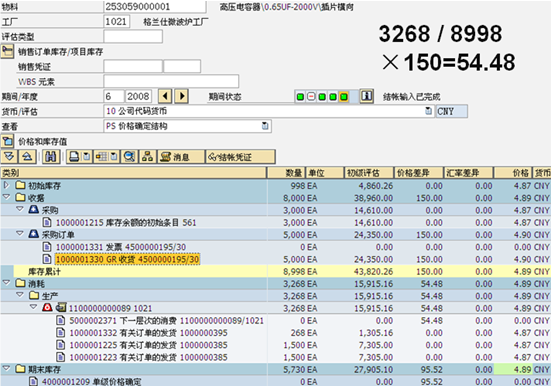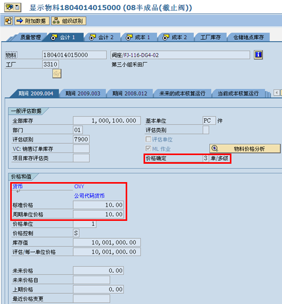 从上图我们可以看到,物料除了标准价外,还多了一个周期单位价格。这个价格类似于移动平均价,不同之处是,这个价格仅在一个周期内有效,我们可以简单的理解为,这是物料在某个期间内,计算得出的移动平均价。