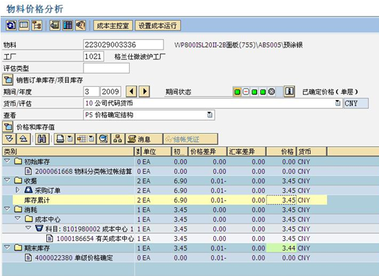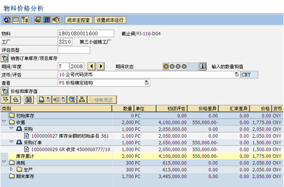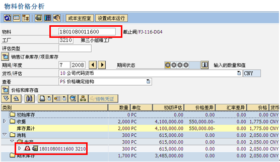 这里显示1804170001160这个物料的价格被修改,系统会根据新旧两个价格自动算出库存价值差异。同时,我们可以在CKM3中对这个物料的价格进行详细的分析,CKM3界面如下所示: