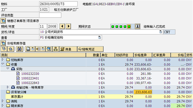 该物料入库数量为1,但总差异达23万。原因是该物料是一个按单的物料,物料分类帐能够区分按单物料和非按单物料的差异。该物料按照订单收货,在发票校验时,产生了一笔23W的采购差异,但该物料并没有按照订单进行校验,从而,按单的发票校验的差异,直接进入该物料非按单的库存中,直接导致该物料非按单库存的实际价格异常。