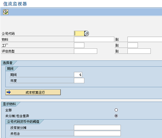 分析物料实际成本 在完成第六步后,建议使用值流监视器,事务代码:CKMVFM,如下图所示,对物料实际成本数据进行分析、核对,如果发现差异异常的物料,可以在正式差异过账前对后勤业务进行调整。调整完毕后,按照调整内容,如果涉及成本中心或生产订单,则可以考虑对生产订单重新结算。如果涉及面不广,则仅需对物料分类帐重新结算。调整完毕后,再进入到第七步。