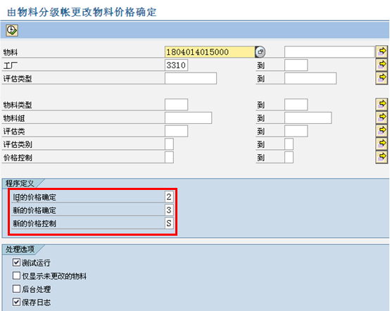 价格确定字段用来控制物料的价格类型,为S还是V。当价格确定为2时,物料可以使用V或者S作为计价方式;当价格确定为3时,物料只能使用S标准价作为计价方式。价格确定由后台配置确定,在启动工厂时,自动默认至物料主数据中。在物料发生业务之前,可以使用CKMM进行批量更改。如下图所示: