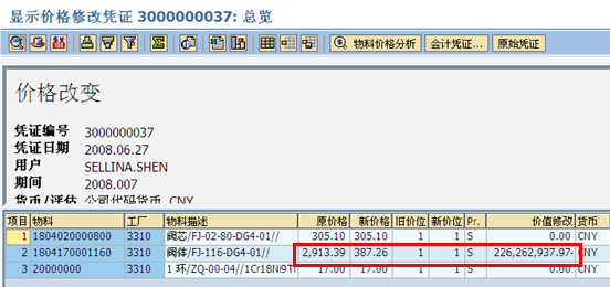 从上图我们可以看到,有两张物料分类帐凭证,第一帐时传统的物料交易凭证,第二张为物料价格变动凭证,如下图所示: