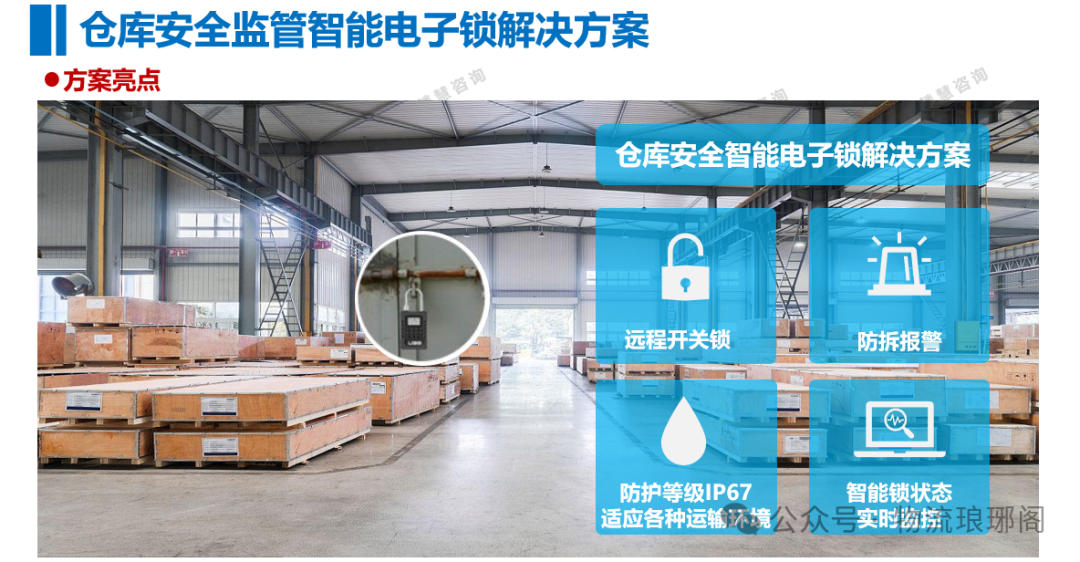 仓库管理中的安全问题是不可忽视的,为了避免安全事故发生,必须加强安全管理和加强员工安全意识和技能的培训,完善各种安全设备和保障措施,确保仓库管理的安全运营。具体应对措施: 1、建立安全制度 制定、完善和执行安全管理制度,建立仓库安全管理档案,注重安全责任制,明确各岗位的安全职责和义务,以及日常安全工作的记录和汇报。 2、定期检查维护 定期检查仓库设备和器材的状态,及时修缮和更换不良设备,如货架结构、电线等。对于储物箱、保险柜等应常年定期更换。 3、加强员工安全教育 对仓库员工定期进行安全知识培训和操作技能的培训,提高员工安全意识和技能水平。同时,制定安全操作规程,明确各个环节的操作标准和注意事项。 4、应用物联网技术与智能监控 物联网技术在仓库安全管理中发挥着越来越重要的作用。物联网技术,可以实现对仓库内设备、货物、人员的实时监控和管理。通过安装仓库智能电子锁,可以实时监控人员的操作行为,还能自动识别和报警异常情况。【产品介绍】仓库安全监管智能电子锁解决方案 此外,利用仓库智能电子锁可以对仓库的各项安全数据进行汇总分析,为安全管理提供科学的决策依据。