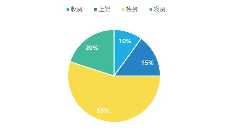 来咨询的老板或者仓库负责人,80%以上的人都会问同一个问题:仓库效率低咋办? 说实话这问题一两句话回答不了,因为仓库效率低不能单一归因,布局的问题、流程不合理、绩效不完善等等都是导致仓库效率低的很重要原因。 但是作为仓库管理者,你一定要把这张图上的数据牢牢记在心里:把仓库的总工作量当做100%的话,拣货这项工作占总工作量的一半以上。