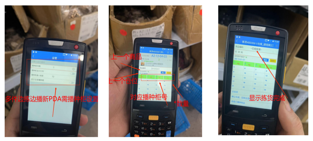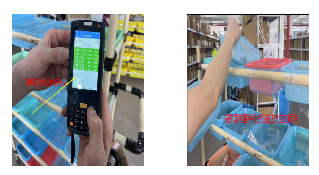 4、在PDA上确认拣货完成后,按照面单播种柜上显示将商品分别放入对应的框内,拣货完成。
