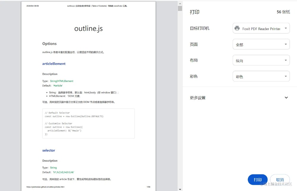 /* 其它可选位置:@bottom-left @bottom-right */ @bottom-center { /* 页脚右侧显示页码 */ content: "Page "counter(page) " of "counter(pages); } } } CSS 打印样式的应用实践 这里还是以我的 outline.js 项目为例,以下是使用了 outline.js 页面的原始界面: