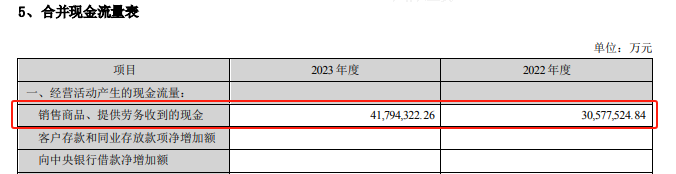 利润表和现金流量表都是动态报表,用来反映企业一段时期内的累计经营情况。其区别在于利润表的编制基础是权责发生制,而现金流量表的编制基础是收付实现制。其中,利润是利润表反映企业经营成果的核心,而与之相对应的经营活动现金流量净额则是现金流量表反映的企业经营成果的核心。因此可以说,利润表中的利润是权责发生制下的利润,而经营活动现金流量净额是收付实现制下的利润。需要将两个表综合起来考量,以便更加准确地把握企业在一段时间内的经营成果。一般从以下几个方面考察:一是通过现金流量表中的“销售商品、提供劳务收到的现金”和“收到的其他与经营活动有关的现金”这两个项目来了解企业营业收入的含金量。因为在权责发生制下的收入并不一定代表企业收到了相应的现金,通过现金流量表来辅助了解企业营业收入的含金量。这两个项目一般有如下的勾稽关系:销售商品、提供劳务收到的现金=营业收入+本期收到的增值税销项税额+应收账款(期初余额-期末余额)+应收票据(期初余额-期末余额)+预收款项(期末余额-期初余额)-当期计提的坏账准备等调整项目样本企业2023年利润表中营业收入为4009亿元,现金流量表中“销售商品、提供劳务收到的现金”和“收到其他与经营活动有关的现金”合计4179+157=4336亿元,可以看出样本企业营业收入的含金量是很高的。至于收到的现金大于营业收入,则可能是应收账款的减少、预收账款的增加等,一般反映企业在产业链中的地位比较高。