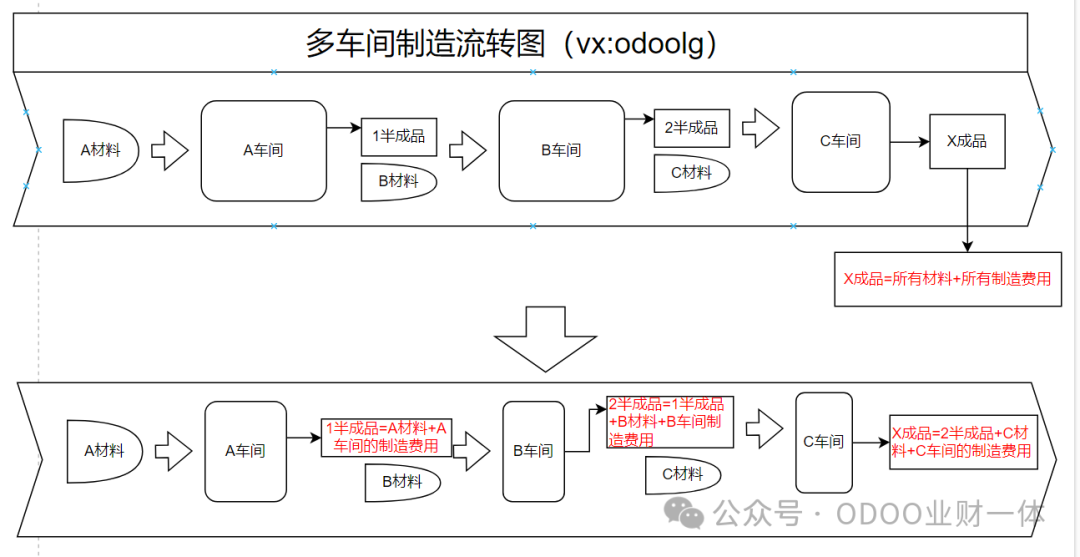 (以上为ERP系统截图) 例如:X成品,需要经过3个车间(A、B、C),每个车间有独立的设备,独立的管理人员,有不同的加工工序及耗用材料。如图: