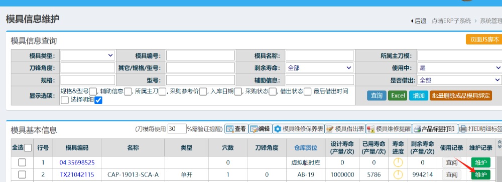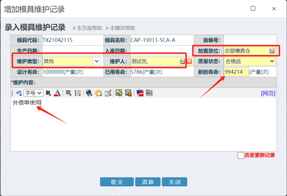 进入界面后,登记维护类型,维护人,放置货位,输入新寿命,记录维护类型等信息,点击“提交”完成操作,如下图所示: ![]() 点晴模切ERP更多信息:https://moqie.clicksun.cn,联系电话:4001861886 该文章在 2024/10/8 8:56:57 编辑过 |