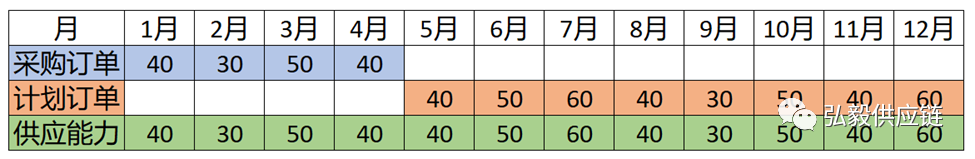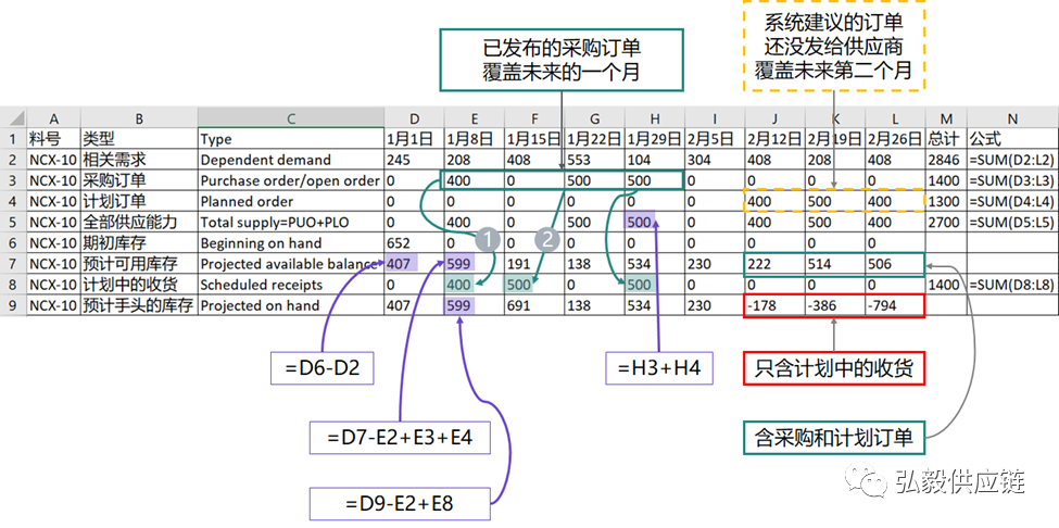 在上图中,采购订单到货日期1月份是40,2月份是30,依此类推,截止到4月份为止。随后是计划订单数量,5月份是40,6月份是50,直至12月。 两行汇总的就是供应能力。显然,计划订单的时间覆盖更长,可以达到系统设定的最大值。 3.计划中的收货 采购订单发布后就处于开放的状态,货物收到后,订单会关闭。开放订单Open order需要供应商回复确认的送货日期,根据运输时间,推算出到货日期,这就是计划中的收货Scheduled receipt,它可能早于或晚于采购订单中要求的到货日期,因为供应链中存在着一些不确定性。 如果供应商没有确认送货日期,那么就使用采购订单中的履约日期。 4.库存状态 1)期初库存 这是期初仓库里的可用库存,也就是Beginning on hand。相应地,我们还要知道每个时间段期末还会剩下多少库存,这个数字可用来判断库存是否健康。期末库存使用Projected这个词,用来表示预计的库存数量。 2)预计手头的库存 预计在末期有多少库存会在我们的仓库里,这就是Projected on hand,缩写POH,它的计算是用上一期的期末预计库存,减去需求量,再加上本期的计划中收货。 预计手头库存只考虑了Scheduled receipt,意味着它只会统计已经确认的到货,而采购订单或计划订单没有统计在内。 这里有一个问题,那就是计划中到货的时间跨度较短,随着时间推移,预计手头库存会出现负数,所以我们还需要一个库存状态来推算更长时间的库存情况。 3)预计可用库存 这就是Projected available balance,简称PAB,它使用了采购订单和计划订单的总数量,实现了系统内最长时间跨度的预计库存计算。 说了很多的概念,接下来我用一个Excel表格来介绍它们之间的计算关系。 二 案例计算 假设我们需要采购编号为“NCX-10”的物料,到货提前期是1天。时间单位是周,那么需求量和采购量都被汇总为周,采购订单发布和预计到货都是在当周中的某一天。 时间单位可以是天、周或是月,在使用的时候需要注意统一Time bucket单位,不能出现不同的时间单位。
