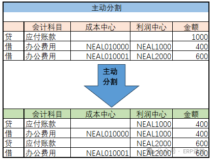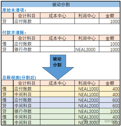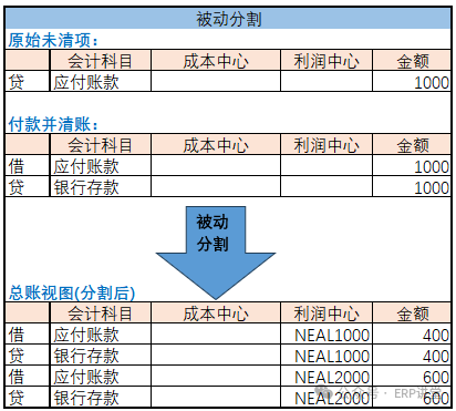 被动分割:根据主动分割的结果进项记账时,系统进项分割;例如,付款清账中,付款的银行科目的分割时基于被清账的应付账款行项目中集成的,该分割规则是系统固定的不需要配置;