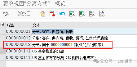 2.分配凭证拆分方法 事务代码:SM30 - V_FAGL_ACTIVEC_2 系统路径:IMG→财务会计->总账会计->业务交易->凭证拆分->扩展凭证拆分->分配凭证拆分方法 配置目的:维护系统使用的凭证分割方法 配置屏幕: