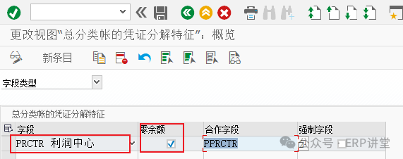 4.定义总账会计核算的凭证分解特征 事务代码:SM30 - V_FAGL_SPLIT_FLD 系统路径:IMG→财务会计->总账会计->业务交易->凭证拆分->定义总账会计核算的凭证分解特征 配置目的:定义凭证分割的特征维度 配置屏幕: