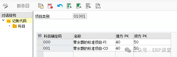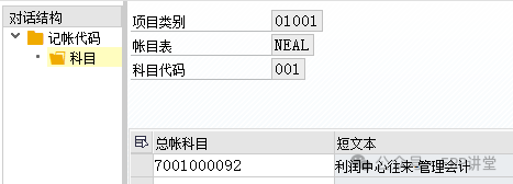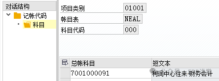000:财务凭证记账时,零余额分割时使用的中间科目; 001:CO凭证记账时,零余额分割时使用的中间科目; 选中000,或者 001,双击“科目”: