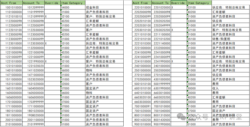 7.为凭证拆分给总分类账科目分类 事务代码:SM30 - 系统路径:IMG→财务会计->总账会计->业务交易->凭证拆分->为凭证拆分给总分类账科目分类 配置目的:维护会计科目对应的项目类别 配置屏幕: