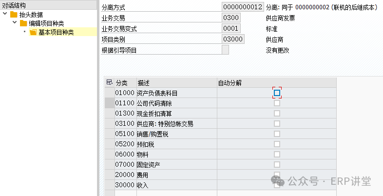 维护哪些科目需要执行凭证分割,为需要凭证分割的科目设定分类; 分类:实际上就是对会计科目的一个分组,凭证分割的程序通过凭证中的会计科目来定位项目类别,并来进行后续逻辑。 SAP 预定义项目类别: