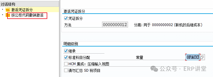 8.定义凭证拆分规则 事务代码: 系统路径:IMG→财务会计->总账会计->业务交易->凭证拆分->激活凭证分解 配置目的:激活公司代码的凭证分割 配置屏幕: 一般使用SAP预定义的配置,不用修改;