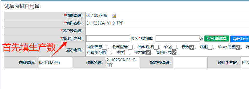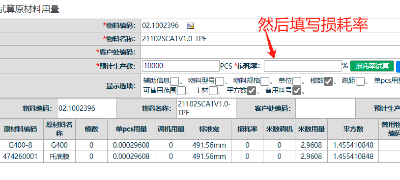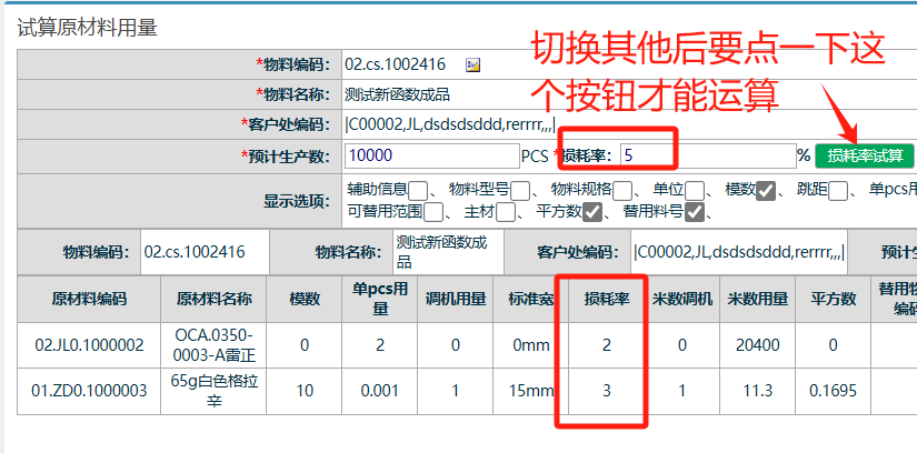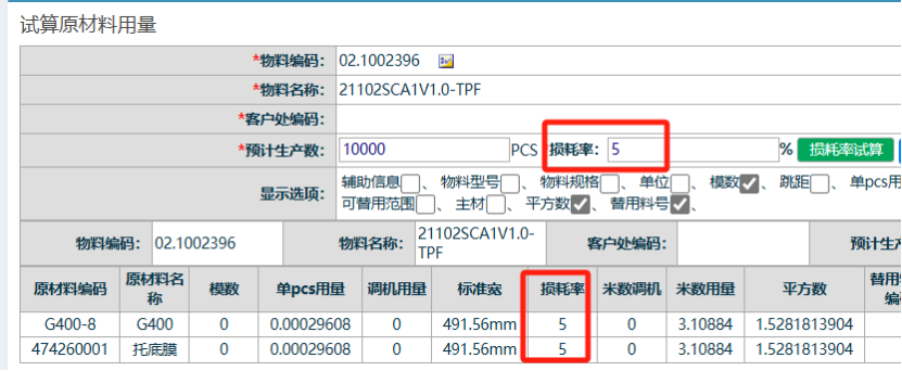 点晴模切ERP-BOM试算功能-损耗率试算