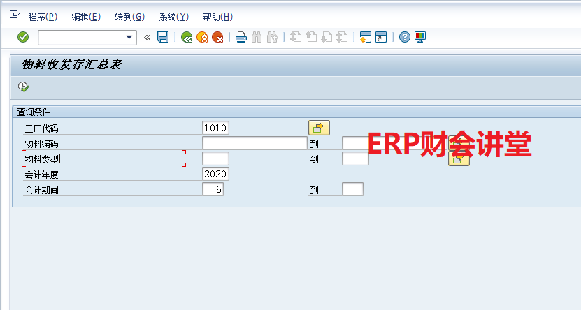 遗憾的是,SAP中也没有这样的报表,不过SAP很灵活,支持用户进行自定义的开发。按照CKM3N的逻辑将数据取出来,进行汇总输出,不就是收发存汇总表吗? 根据如上逻辑,我们实现了收发存汇总表,初始界面如下。