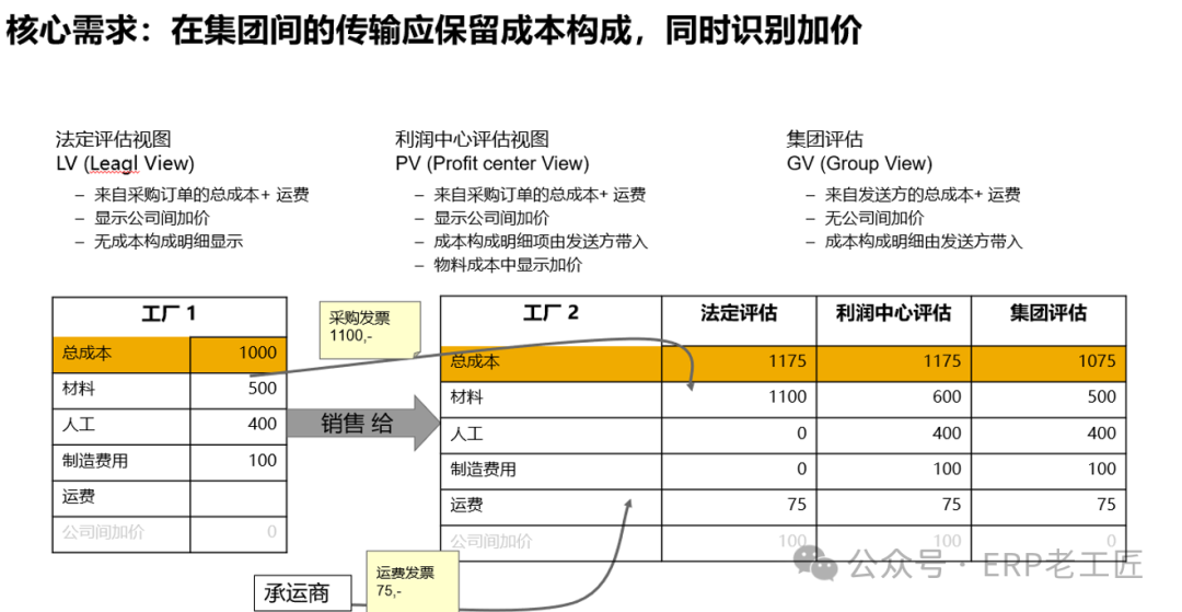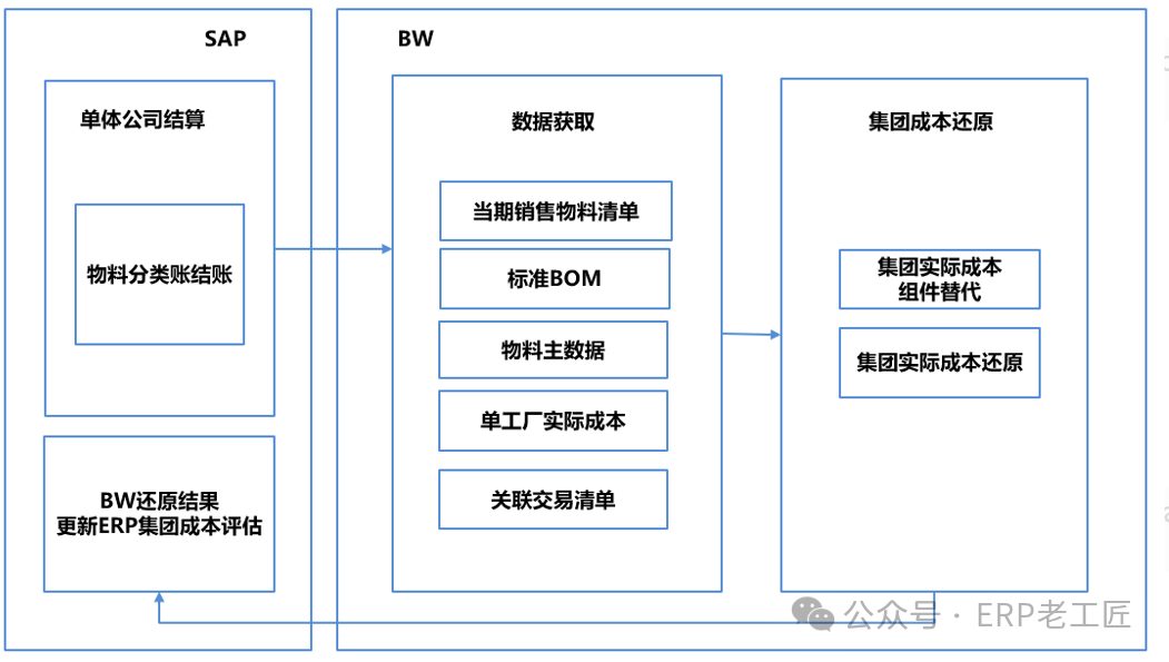概述:什么是成本还原, 为什么SAP项目中成本还原成为难点,成本还原在管理会计中的意义是什么? 成本还原(Cost Recovery),就是将产成品耗用各步骤半成品的综合成本,逐步分解还原为原来的成本项目。成本还原的方法是从最后步骤开始,将其耗用上步骤半成品的综合成本逐步分解,还原为原来的成本项目。 1.在业财一体化条件下,结账采用“综合结转”法,即上步骤的产品,是以综合成本总数结转到下步骤的,SAP的集成的实时过账,更加加剧了这个特点。 2.SAP系统计算实际成本的逻辑:实际成本=标准成本+差异,实际成本由标准成本及多笔差异结转而来,因此要实现完成的成本还原,必然对业务端操作有限制与要求. 3.特别是在集团型企业,跨公司存在着法定“加价”,增加了成本还原的难度,基于法定维度LV(Legal View)的法定存货评估与基于集团维度GV(Group View)背离,及大部分企业的数据基础薄弱,增加了实现成本还原落地的技术难度。 成本还原的管理价值:成本还原是基于集团价值链管理角度的概念,因此,对于整个集团的价值链分析,在预算管理,行业对标,内控分析等具有重要意义: 1)编制预算:基于集团层的预算,成本结构是重要的基础,比如原材料预算,辅助料预算,人工预算,设备预算等,成本还原结构是重要的参考数据,也是搭建很多BI数据分析模型的基础。 2)行业对标:与同行业对比,各种成本结构,各种资源消耗水平是否先进。法人结构可能由于税率等原因,各个公司有不同的设置,但是从管理的角度,相同的行业往往需要进行对标分析,比如汽车,手机,家电等。 3)全价值链分析,展开供应链合作,只有通过成本结构分析,发现价值有效还是无效,对供应链进行整合,比如,对某些成本高的工序进行外包决策等; 4)进行区域,行业等维度的战略分析:解析成本结构,区分交易加价,将集团,产品线,法定三个维度区分,区分各个产品,区域的获利能力。 方案总览:在SAP实施项目中,成本还原方案,按是否跨公司,基于实时交易(OLTP)或基于数据分析(OLAP),老工匠总结了3种解决方案: