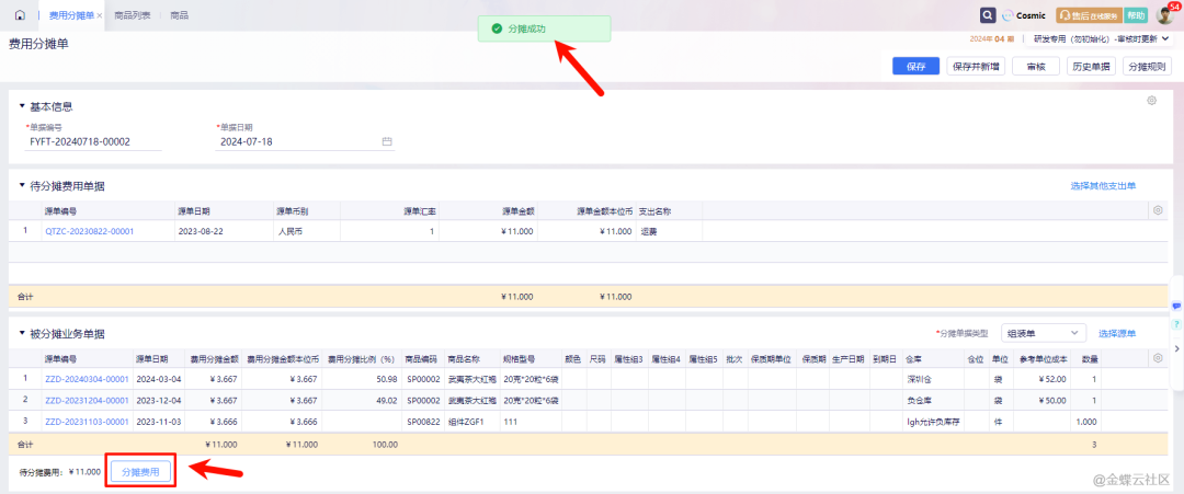 第三步,在费用分摊单主界面,可以看到待分摊的费用金额合计,点击“分摊费用”,系统会根据“分摊规则”中的选项将费用分摊到业务单据的“费用分摊金额本位币”字段中,也可以手工修改,点击保存,审核即可。