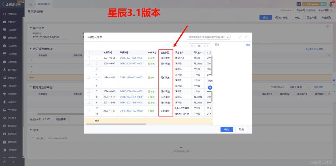 7.2 调拨入库单(同价调拨)注意,星辰2.0只支持异价调拨入库单做为费用分摊的源单,只有星辰3.1才同时支持同价和异价两种类型的调拨入库单做为费用分摊的源单(下图),如需使用,请联系客服或者您的代理商登记升级2.0至星辰3.1