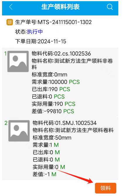 选择某工单点击领料按钮进入 如下图: