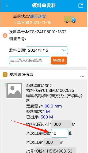 点晴模切ERP-生产领料扫码出库片料操作