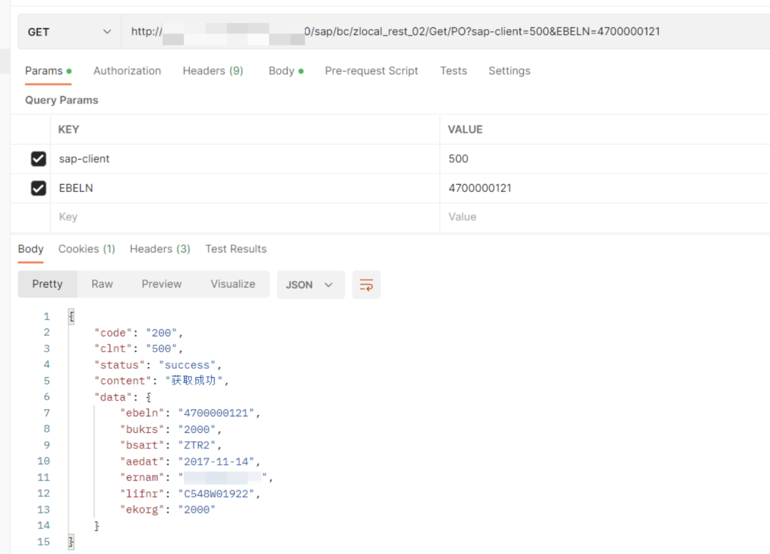 METHOD if_rest_resource~get.*CALL METHOD SUPER->IF_REST_RESOURCE~GET* . DATA: lv_output_json TYPE string. DATA: lv_ebeln TYPE ebeln. DATA: BEGIN OF ls_out, ebeln TYPE ebeln, bukrs TYPE bukrs, bsart TYPE bsart, aedat TYPE aedat, ernam TYPE ernam, lifnr TYPE lifnr, ekorg TYPE ekorg, END OF ls_out. DATA: BEGIN OF ls_output, code TYPE char3, clnt TYPE sy-mandt, status TYPE char10, content TYPE string, data LIKE ls_out, END OF ls_output. DATA(rt_parameters) = mo_request->get_uri_query_parameters( )." 获取参数 " LOOP AT rt_parameters ASSIGNING FIELD-SYMBOL(<fs_par>). TRANSLATE <fs_par>-name TO UPPER CASE. TRANSLATE <fs_par>-value TO UPPER CASE. ENDLOOP. ls_output-clnt = sy-mandt. READ TABLE rt_parameters INTO DATA(ls_par) WITH KEY name = 'EBELN'. IF sy-subrc IS INITIAL AND ls_par-value IS NOT INITIAL. CALL FUNCTION 'CONVERSION_EXIT_ALPHA_INPUT' EXPORTING input = ls_par-value IMPORTING output = lv_ebeln. SELECT SINGLE * INTO CORRESPONDING FIELDS OF ls_out FROM ekko WHERE ebeln = lv_ebeln. IF sy-subrc IS INITIAL. ls_output-data = ls_out. ls_output-code = cl_rest_status_code=>gc_success_ok. ls_output-status = 'success'. ls_output-content = '获取成功'. ELSE. ls_output-data = ls_out. ls_output-code = cl_rest_status_code=>gc_success_ok. ls_output-status = 'fail'. ls_output-content = '获取失败'. ENDIF. ELSE. ls_output-data = ls_out. ls_output-code = cl_rest_status_code=>gc_redirection_permanent. ls_output-status = 'fail'. ls_output-content = '参数错误'. ENDIF.