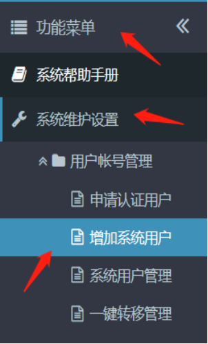1. 登录系统后,直接在OA系统上点击设置 2. 在左侧的功能菜单下的”系统维护设置-->用户帐号管理-->增加系统用户”,点击进入。
