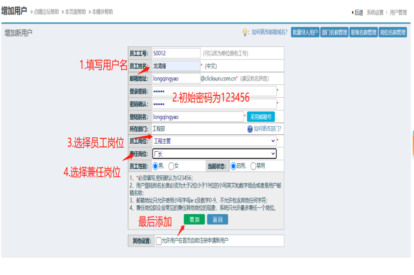 3.填写用户名,选择员位岗位,初始密码为123456。填选完毕后,点击添加即可。 ![]() 4.然后登录测试一下,看是否能正常登录 点晴模切ERP更多信息:https://moqie.clicksun.cn,联系电话:4001861886 该文章在 2024/11/25 14:41:18 编辑过 |