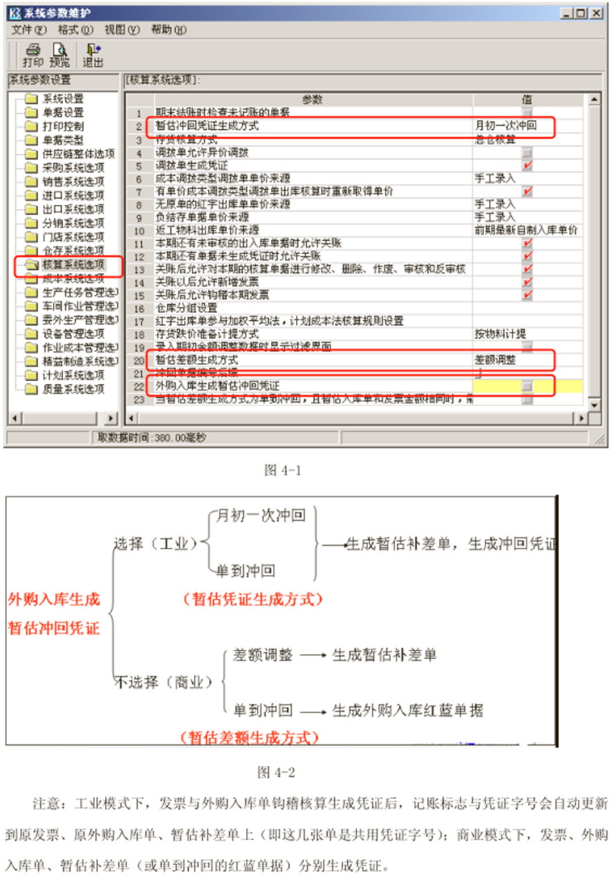 暂估是指本期收到采购的材料录入外购入库单后,若月末时未收到发票账单等结账凭证,对材料的价格进行暂估并入账。在下期或收到发票时,要对之前的暂估做冲回处理,可根据系统参数的设置,选择适合企业的暂估冲回方式。对于暂估的处理主要分为工业和商业的两种处理方式。如果在【系统参数】的“核算系统选项”中勾选“外购入库生成暂估冲回凭证”,则为工业模式,此时参数“暂估冲回凭证生成方式”有效,并且提供“月初一次冲回”和“单到冲回”两种处理方式;如果在【参数系统】的“核算系统选项”中没有勾选“外购入库生成暂估冲回凭证”,则为商业模式,此时参数“暂估差额生成方式”有效,并且提供“差额调整”和“单到冲回”两种处理方式。如图4-1、图4-2: