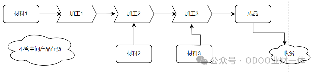 场景2:贸易公司为客户提供产品,除采购基本材料后,其余加工业务全部都是外包,公司没有仓库,也不去核算中间产品,只是核算最终成品的成本。如图: