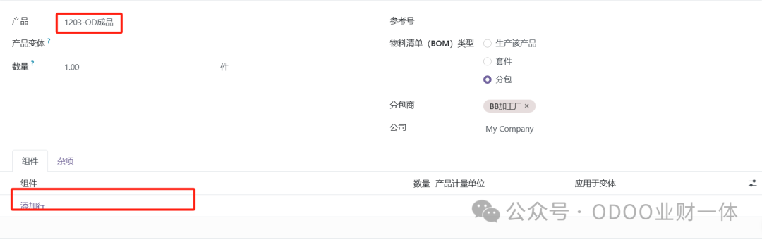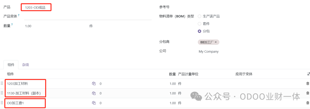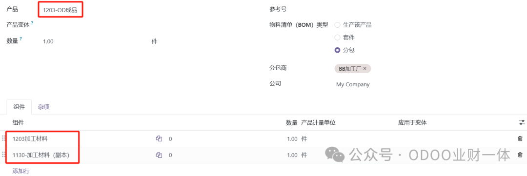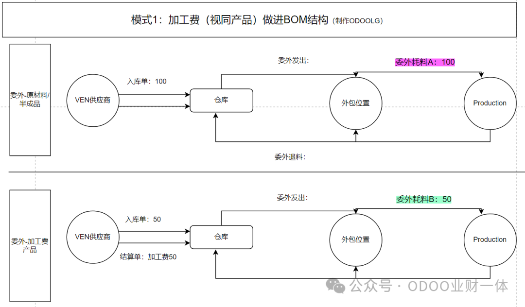 二、ODOO处理委外加工业务的3种模式 模式1:加工成品的BOM结构 = 材料+加工费