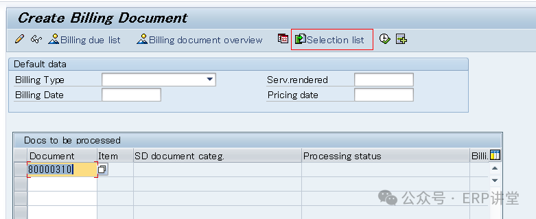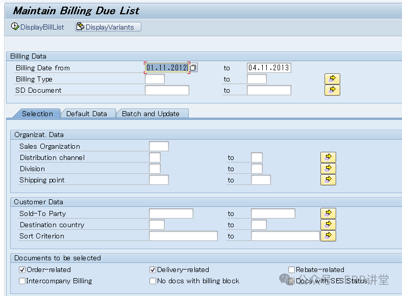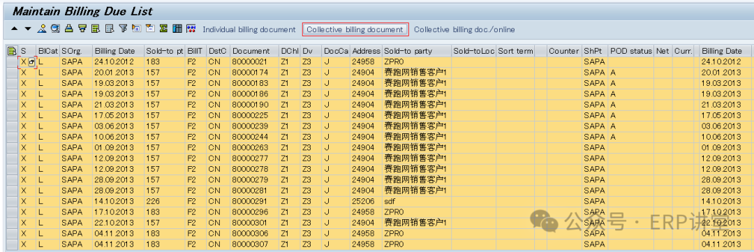 另一种是VF04,输入开票日期和其他一些可选筛选条件。系统会把符合开票日期范围的单据列出来。可以批量开票。
