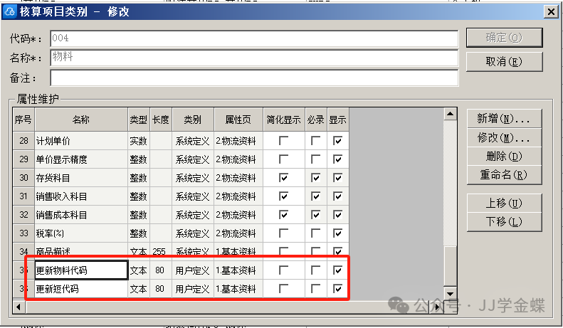 金蝶KIS专业版上线后,发现物料代码长度不够用,若要调整长度应如何处理? 软件标准功能不支持批量修改物料代码,然而客户的这一需求较为迫切。经过对软件的研究,终于找到一种变通实现的方法,具体解决办法如下: 1,在金蝶KIS专业版中为物料增加两个自定义字段,即“更新物料代码”和“更新短代码”(注意字段属性设置与物料代码和短代码一致);