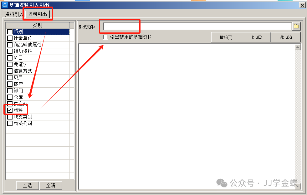 2,在【基础设置】-【基础导入导出】里,将金蝶KIS专业版中的物料导出为Excel文件;