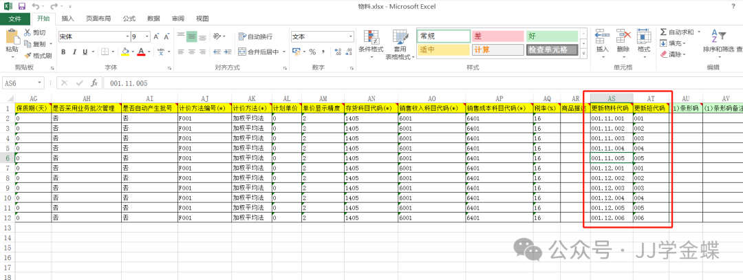 3,在Excel中手工维护需要修改的物料的“更新物料代码”和“更新短代码”字段信息;
