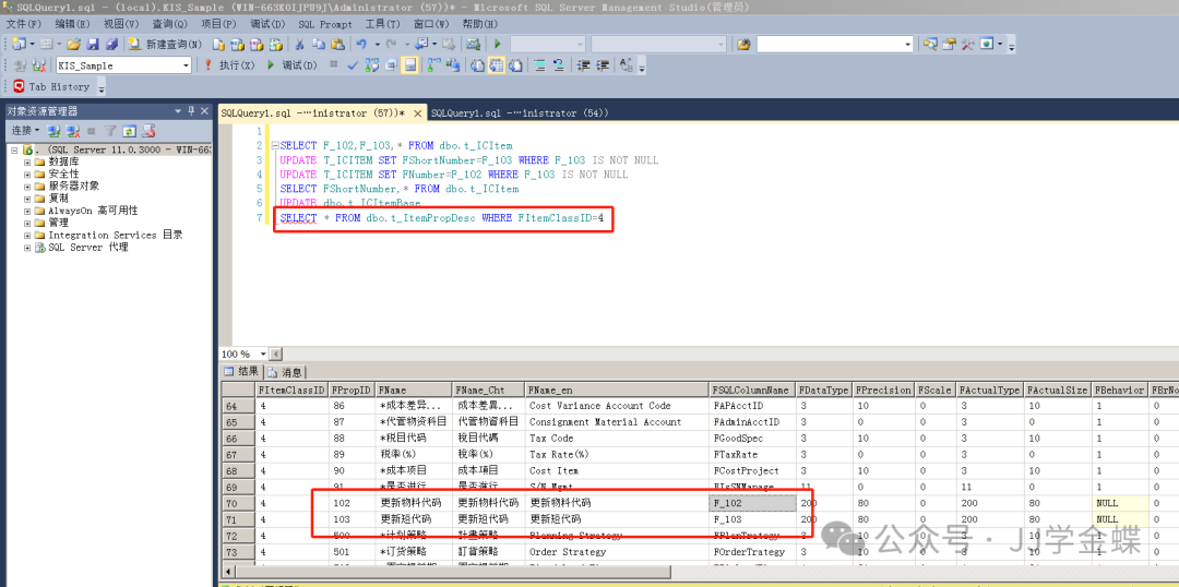 5,前往SSMS控制台通过语句更新t_Item和t_ICItem。 登录SSM控制台通过语句查看新增字段的名字为F_102和F_103: SELECT * FROM dbo.t_ItemPropDesc WHERE FItemClassID=4