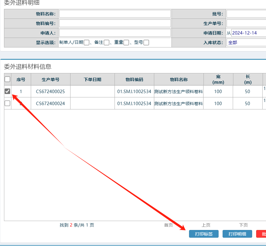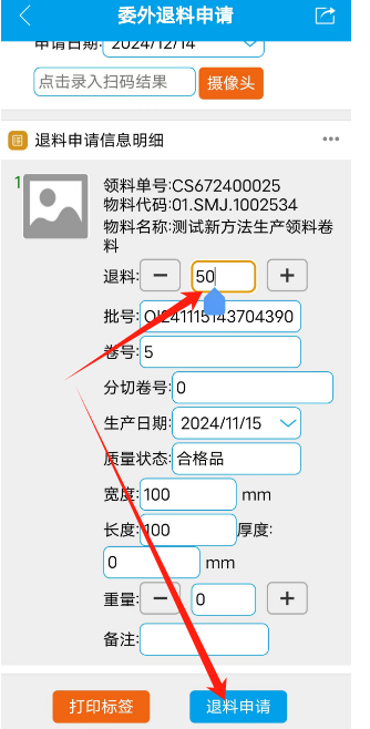修改米数后,点击退料申请 如下图: 然后到电脑端打出标签贴上 如下图: