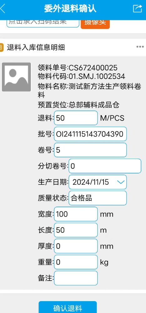 扫描委外退料标签的信息,然后点击确认退料入库