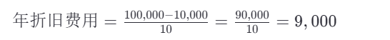 因此,每年的折旧费用为9,000元。 详细步骤 1. 确定资产原值: - 例如,资产原值为100,000元。 2. 确定残值: - 例如,残值为10,000元。 3. 确定预计使用寿命: - 例如,预计使用寿命为10年。 4. 计算年折旧费用: