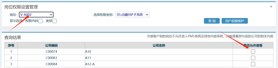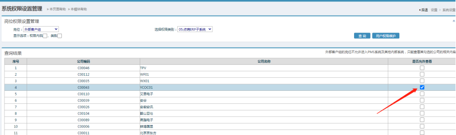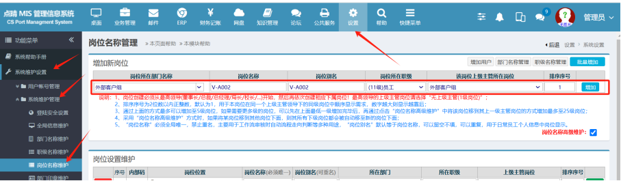 操作步骤:设置-系统维护设置-系统维护管理-岗位名称管理,在外部客户组岗位创建下级岗位,如下图所示: 2. 在左侧的功能菜单下的”系统维护设置-用户帐号管理-增加系统用户”,点击进入。 3、填写用户名,选择员位岗位,注意岗位需要选为外部客户组下级岗位,初始密码为123456。填选完毕后,点击添加即可。 注意:岗位一定要选外部客户组下级岗位如下图所示: 3. 设置ERP权限 操作步骤:ERP-系统管理-用户管理-用户权限维护,如下图,注意选ERP子系统权限