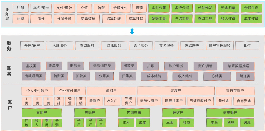 账户服务:对外提供的账户能力,如账户开通、注销、入账、扣账、调账等;