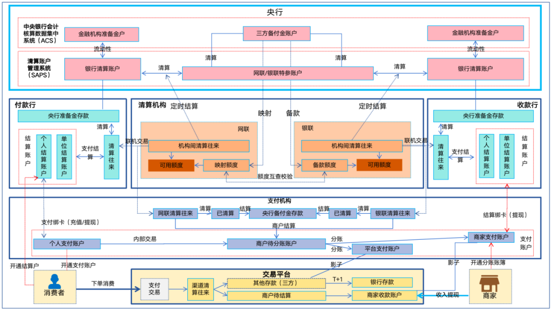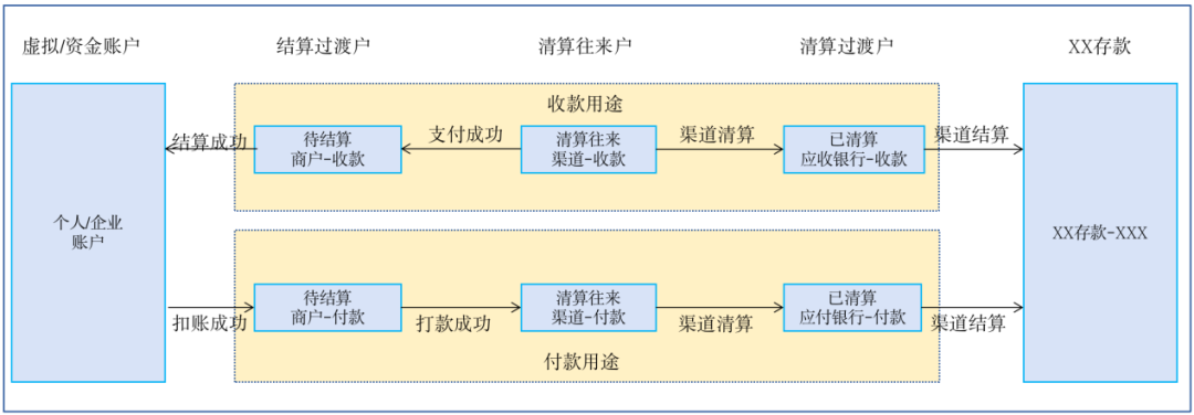 账户是根据会计科目设置的,具有一定格式和结构,用于反映会计要素的增减变动情况及其结果的载体,而账户体系是支付交易的基础,就像电池对于手机,油罐对于加油站,心脏对于人体,是管理账户的信息化系统。现代电子支付离不开各类账户的参与,又因为支付体系中存在众多机构参与者,因此也必将存在种类繁多的资金账户,要想悟透支付,参透账户体系非常重要。从不同的视角看,账户有不同的分法,例如从财务视角,账户可分为资产类、负债类、所有者权益类、损益类、共同类等;因为要研究支付,所以我们更关注跟支付相关的账户,也就是跟货币-银行存款相关的账户,这类账户又可以从账户用途或者机构归属去划分。从账户用途的角度去划分,在整个清结算链路上可以将账户划分为“存款账户、中间过渡户(清算往来、已清算、待结算)、客户虚拟账户等”。从机构归属的角度去划分,又可以分为央行清算账户、银行结算账户、支付机构支付账户、普通企业虚拟账户等。而每个机构的账户又可以进行二次多级分类,例如银行账户又可以分为个人结算账户、企业结算账户;支付机构的账户可以分为个人支付账户、企业支付账户;而银行个人结算账户又可以分为一二三类户。金融监管的本质实际上是对不同机构的不同类型的账户进行个性化监管,例如银行的个人结算账户和单位结算账户分别适用于不同的监管条例;而个人结算户的一类二类三类户又拥有不同的账户交易权限。如此富有层次的账户体系,支撑起了如此庞大的支付清算体系,使得各类资金在不同机构、不同账户之间进行流转,也正因为有这么庞大的账户体系,现代支付的实现才成为可能。根据账户用途的不同,可以将账户分为如下5类:客户账户、结算过渡户、清算往来户、已清算应收付账户、XX存款户;各类机构会基于实际情况选择设定这5类账户中的一种或者多种用于自己的清结算业务,其中客户的账户就是我管别人的钱,而XX存款就是我的钱被管在XX那。在不同的机构,这5类账户的性质会有所不同,例如对于银行来说客户账户就是个人或企业结算账户,属于资金账户,而存款多指在央行的存款或者在其他金融机构开立的存款账户。对于支付机构来说,客户账户就是支付账户,而存款多指存放在央行的备付金存款账户的资金。同样清算往来账户登记的也有差别,支付机构的清算往来是指与网联银联的往来;而交易平台的清算往来指的是交易平台与支付机构的支付往来。有了对于账户的这个基本原理的认知,再理解各类机构的账户设定就容易多了。支付账户可以分为个人支付账户和企业支付账户;该账户实际上是一种虚拟记账账户,真实的资金存放在央行。企业支付账户多是用于登记其商户的代收预付的款项,最终会结算至企业绑定的同名银行单位结算账户中。个人支付账户主要是用于零售消费使用,可以通过绑定的个人银行结算户进行资金充值,同样也是一个虚拟记账账户,真实的资金也存放支付机构在央行的备付金账户中。银行结算账户也就是我们所熟悉的银行卡的底层账户,可以分为个人结算账户和单位结算账户,这类账户是整个社会的金融基础,个人存款、消费等的资金存放处。央行的账户与支付比较密切的就是三方备付金账户以及银行和网银联的清算账户,跨机构支付清算在这些账户之间完成最终的资金清算。断直连以后,网银联为支付机构在其前置系统内开设清算用途的虚拟账户,用于央行备付金的映射管理、机构间清算往来登记、可用额度管理。这里的所有余额都只是虚拟记账,是机构间交易的清算结果,真实的资金存放在各机构在央行的备付金账户中,只有在结算场次将各机构的清算净额提交央行完成最终清算以后,央行备付金余额才会发生变动。