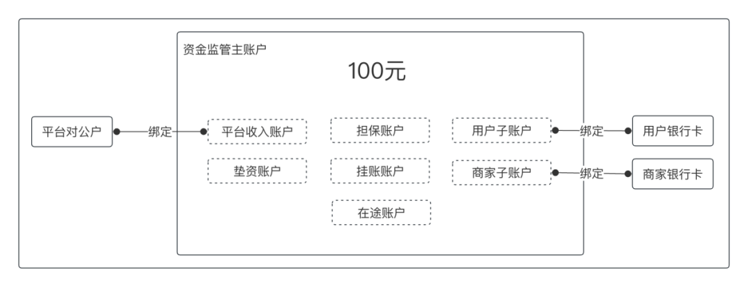账户结构一方面是账户本身的结构有什么组成,另方面就是账户与账户之间的构成关系。简单的账户结构可以分为单类型账户和多类型账户,单类型账户是只有一个类型的账户,整个账户系统只有一类账户,或者有多个类型的账户,但账户层级只有一级,本质上依然很简单,很容易管理。随着业务的复杂度增加,各类功能性需求以及业务需求增加,简单的账户结构变得不够用了,难以支撑更复杂的业务模型,例如每个业务线都要推出一种红包营销形态,有保险业务线的红包,也有游戏业务线的红包,而红包又被拆分成了现金红包、虚拟币红包,这种情形下红包账户结构就成了多层级的复杂账户结构。某些监管类账户的结构更加复杂,不仅存在多层级的账户关系,还从业务层面对账户进行了分组,如下图所示,是具有众多子账户的账户结构,协同完成资金的监管和分账职能。