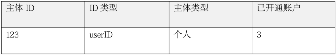 在创建主体的同时就需要定义每一类主体的唯一识别ID。在开户的时候,需要使用这个唯一识别ID作为账户主体的唯一识标识。个人的唯一ID可以是身份证,在开银行卡的时候就是用的身份证ID作为个人的唯一识别ID,在办理社保的时候也是用身份证ID作为身份的唯一识别ID;唯一ID的条件就是能够唯一识别这个主体,其中:个人的唯一ID可以是身份证、手机号、社保号、一个平台的userID,其他的在这个平台的唯一ID;企业的唯一ID可以是统一社会信用编号,也可以是对公户的卡号等;如果企业入驻了一个平台,那么这个平台为这个企业生成的企业编码也可以唯一识别这个企业。唯一ID的用途是唯一识别这个主体,但有时候可能这个主体的唯一身份ID不够用,比如这个人在淘宝即是个人用户又是商家用户,那么他在开户时可能就不能只用身份证了,而是用个人身份的userID 和商户身份的 bussid。为了安全起见,平台需要核查主体的身份,像去银行开户需要本人到场+身份证核验;二类户的开通需要多要素鉴权识别主体身份的合法性。对于企业来说可以通过企业的营业执照、法人签字、盖章或者对公户小额打款来验证企业的真实身份怎么管理这些主体呢?一个平台的各主体信息一般是放在用户中心,用户中心去调用账户中心为主体开通相应的账户。用户中心存储着主体的基本信息,比如ID信息、属性信息、权限信息、关系信息等。要新增信息就增加字段即可,也可以将信息进行分类,每一类记录到不同的表中,比如身份信息、认证信息、账户开通信息等,如下表所示。生成了主体信息以后,就可以通过人工方式开户,也可以通过上游系统调用开户接口为主体开通相关账户,例如通过接口开通账户传入了以下信息: